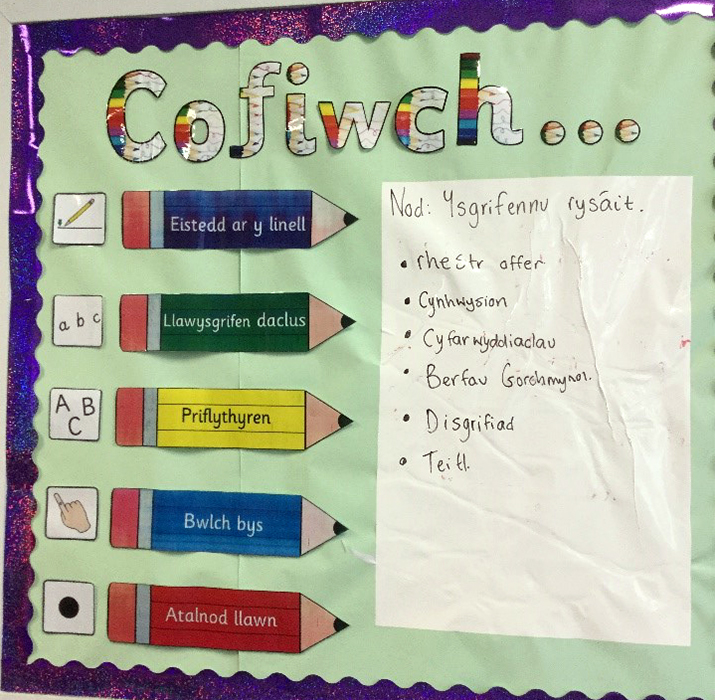 Rydym wedi addasu ein cynllun marcio fel bod llawer mwy o ‘feedback’ effeithiol yn digwydd rhwng yr athrawon a’r disgyblion. Golygai hyn fod y plant yn adnabod eu camgymeriadau ac yn ymwybodol o’r camau nesaf sydd angen gwneud er mwyn gwella. Rydym yn defnyddio ‘pinc perffaith’ i dynnu sylw at yr hyn y maen’t wedi gwneud yn dda a ‘glas gwella’ i dynnu sylw at gamgymeriadau neu rhywbeth sydd angen ei addasu/newid. Mae’r plant hefyd yn marcio gwaith eu hunain a gwaith eu gilydd yn defnyddio’r cynllun marcio yma lle gaiff llawer o drafodaeth rhwng y plant am eu dysgu eu hunain.